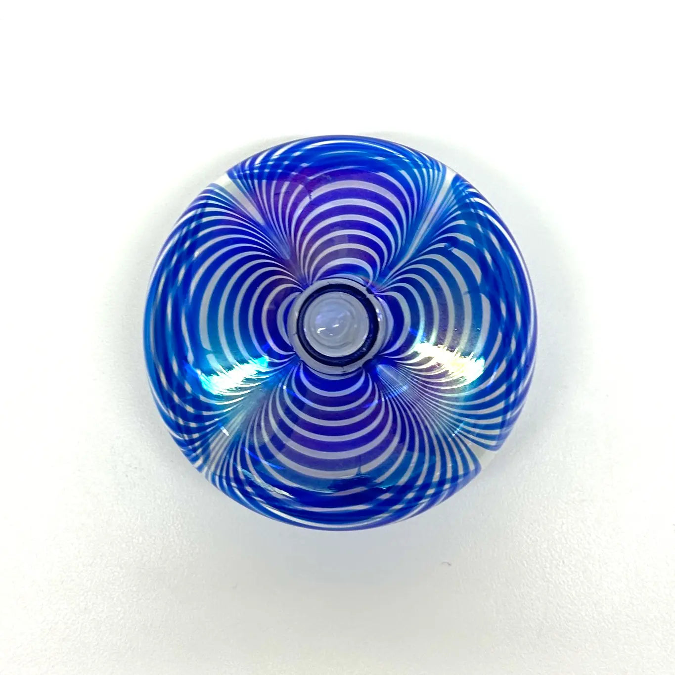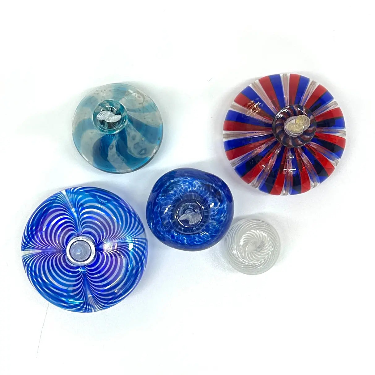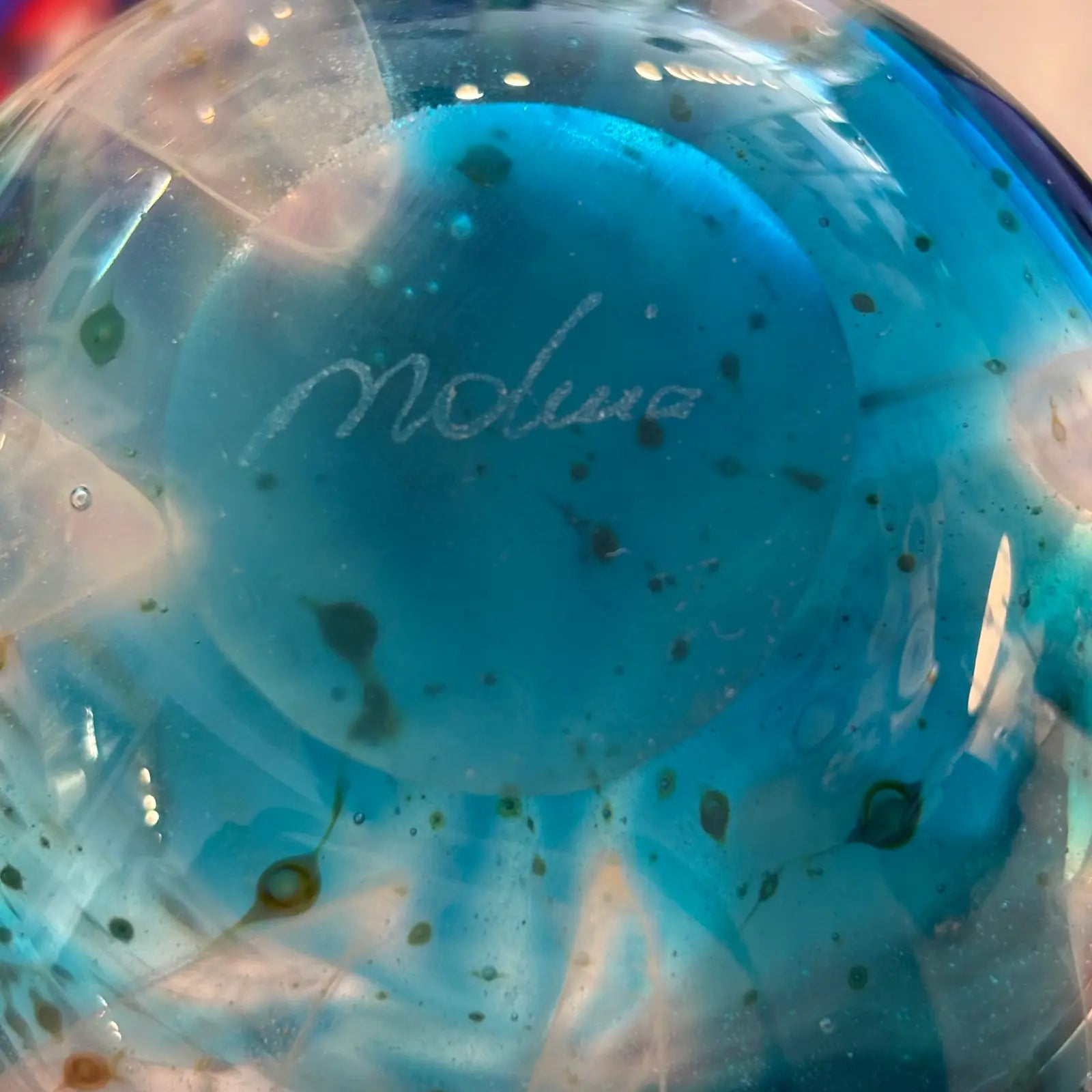 - Shiny cobalt blue and clear swirl hand-blown art glass perfume bottle with a rounded stopper; the stopper seems to have been broken off, which is why it is rounded. 3.5"H x 4.25"W