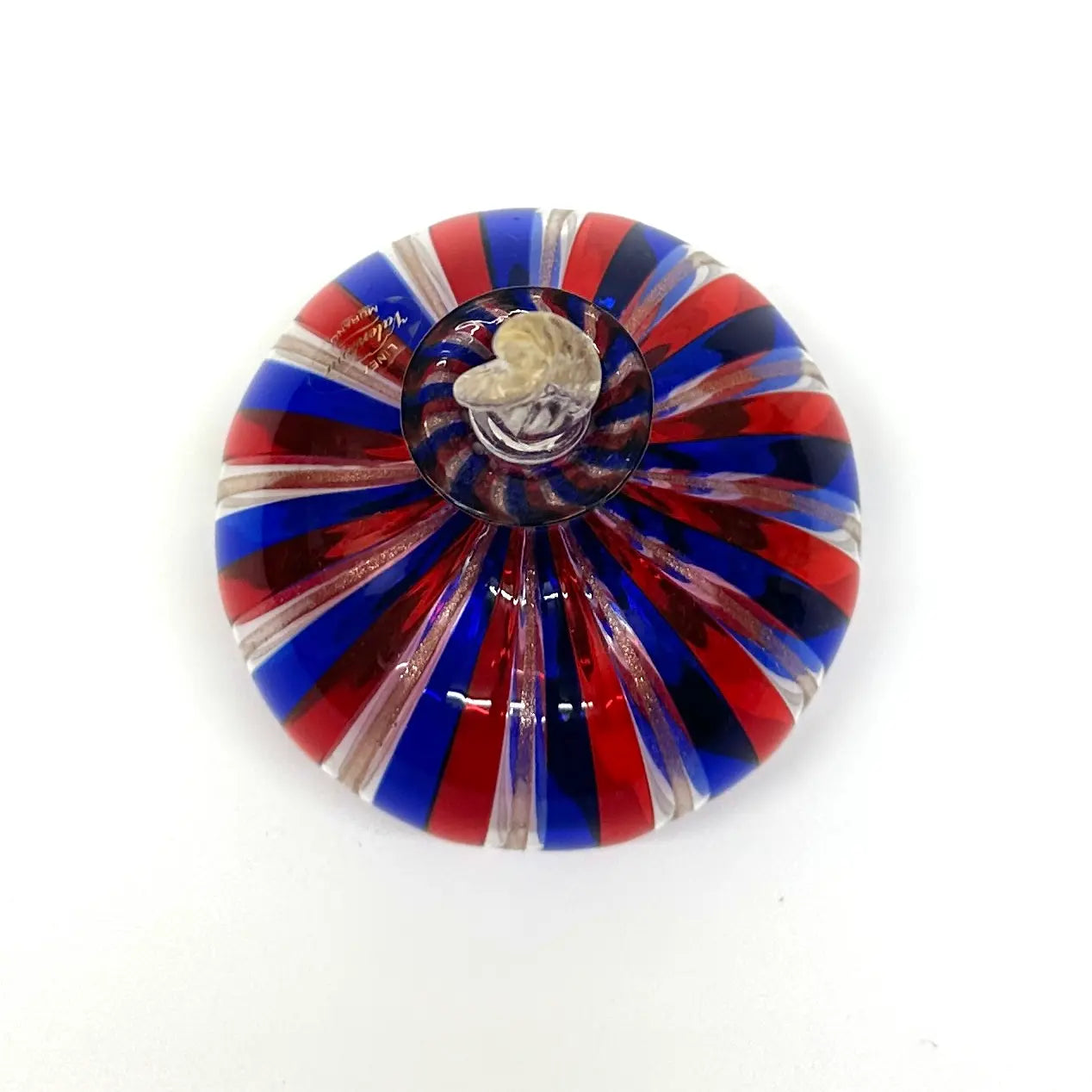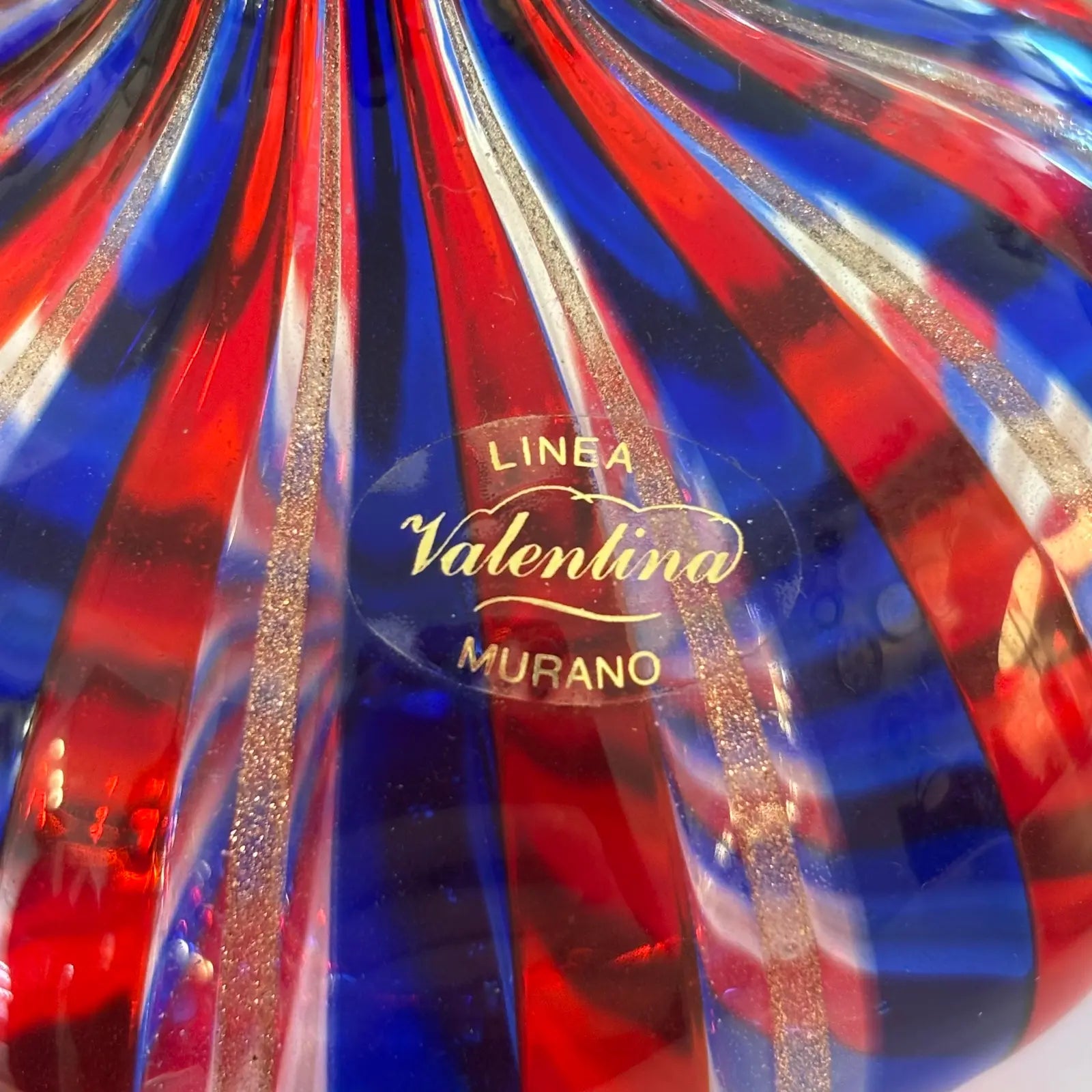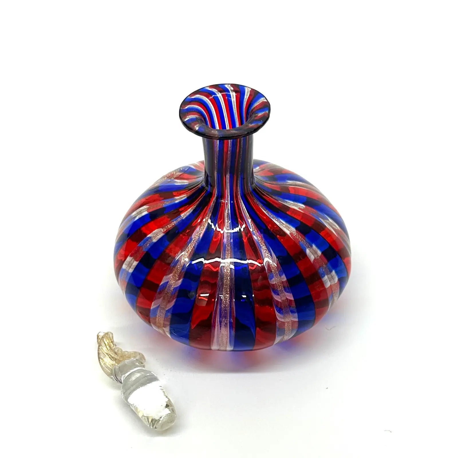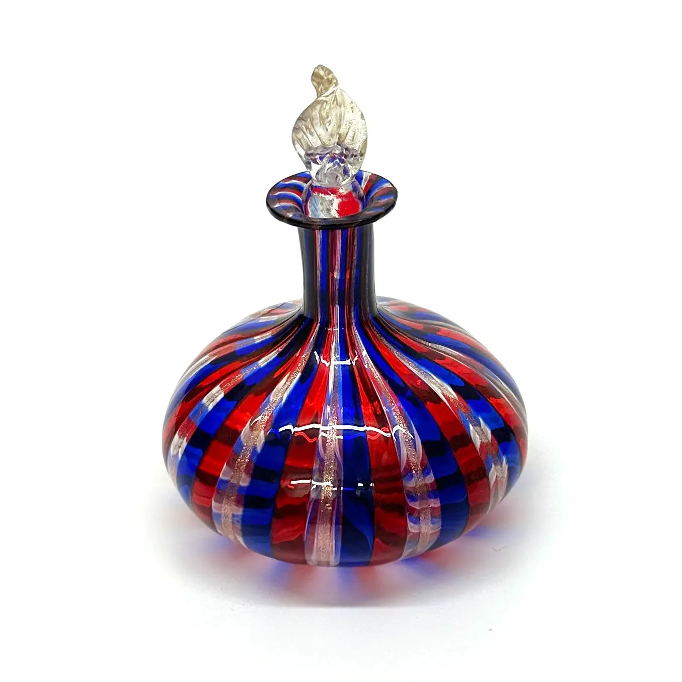 - Red, blue, and gold striped hand-blown art glass perfume bottle with a twisted leaf stopper, by Murano. 5.5"H x 4"W