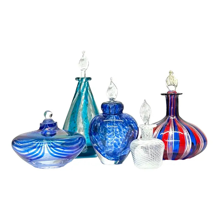 A stunning assortment of red and blue, clear perfume bottles with stoppers in a variety of patterns, shapes, and sizes. These bottles are primarily made by Murano with assorted stoppers.