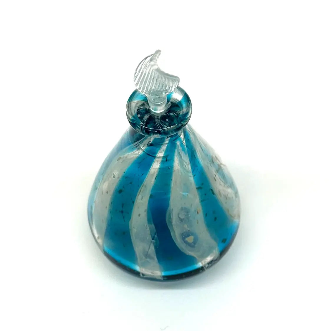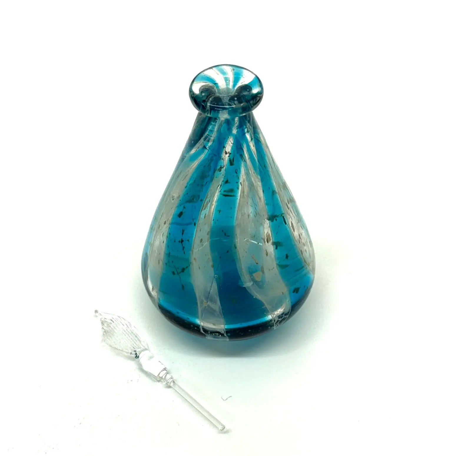- Turquoise, clear, and amber tall twisted striped and splatter art hand-blown glass perfume bottle with a twisted leaf stopper, by Mdina. 6.75"H x 3.5"W