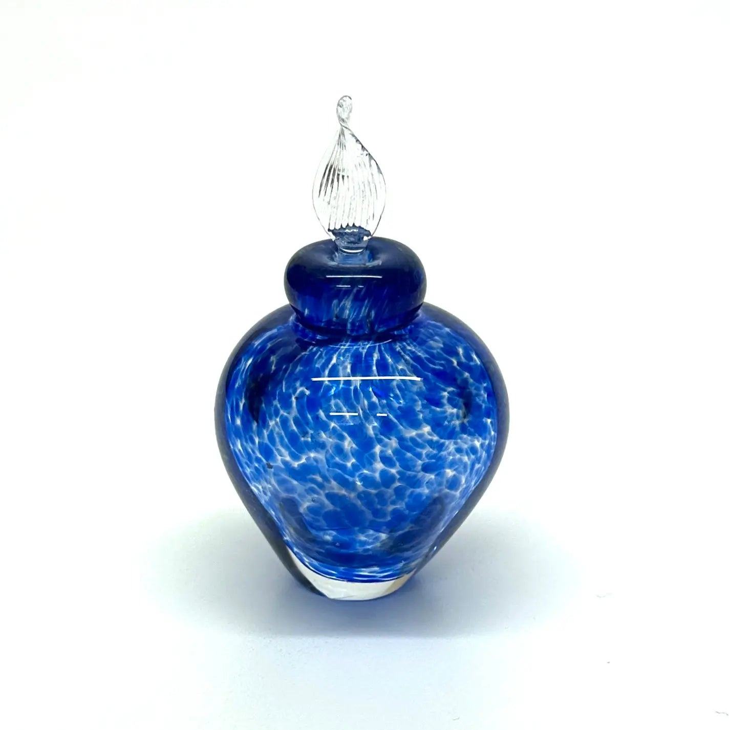 - Bulbous cobalt blue and clear tall speckled hand-blown art glass perfume bottle with a twisted leaf stopper, by Murano. 5"H x 2.75"W