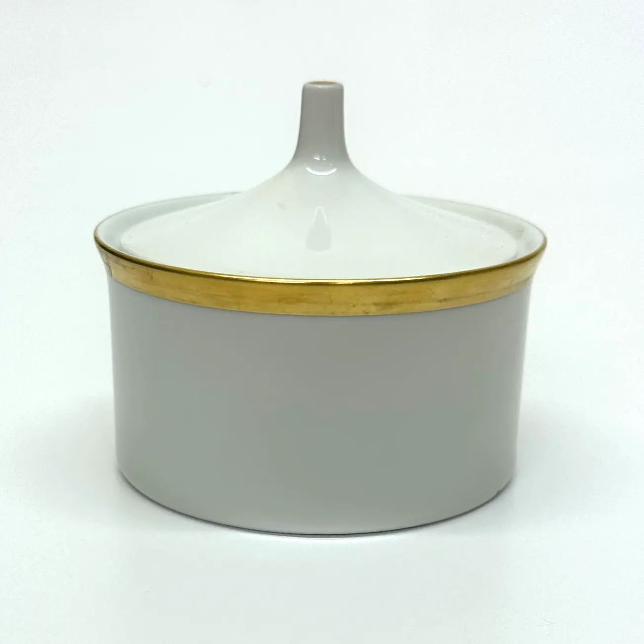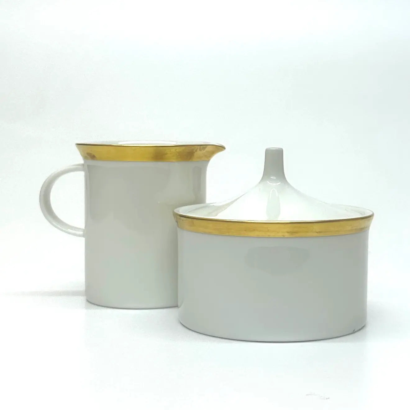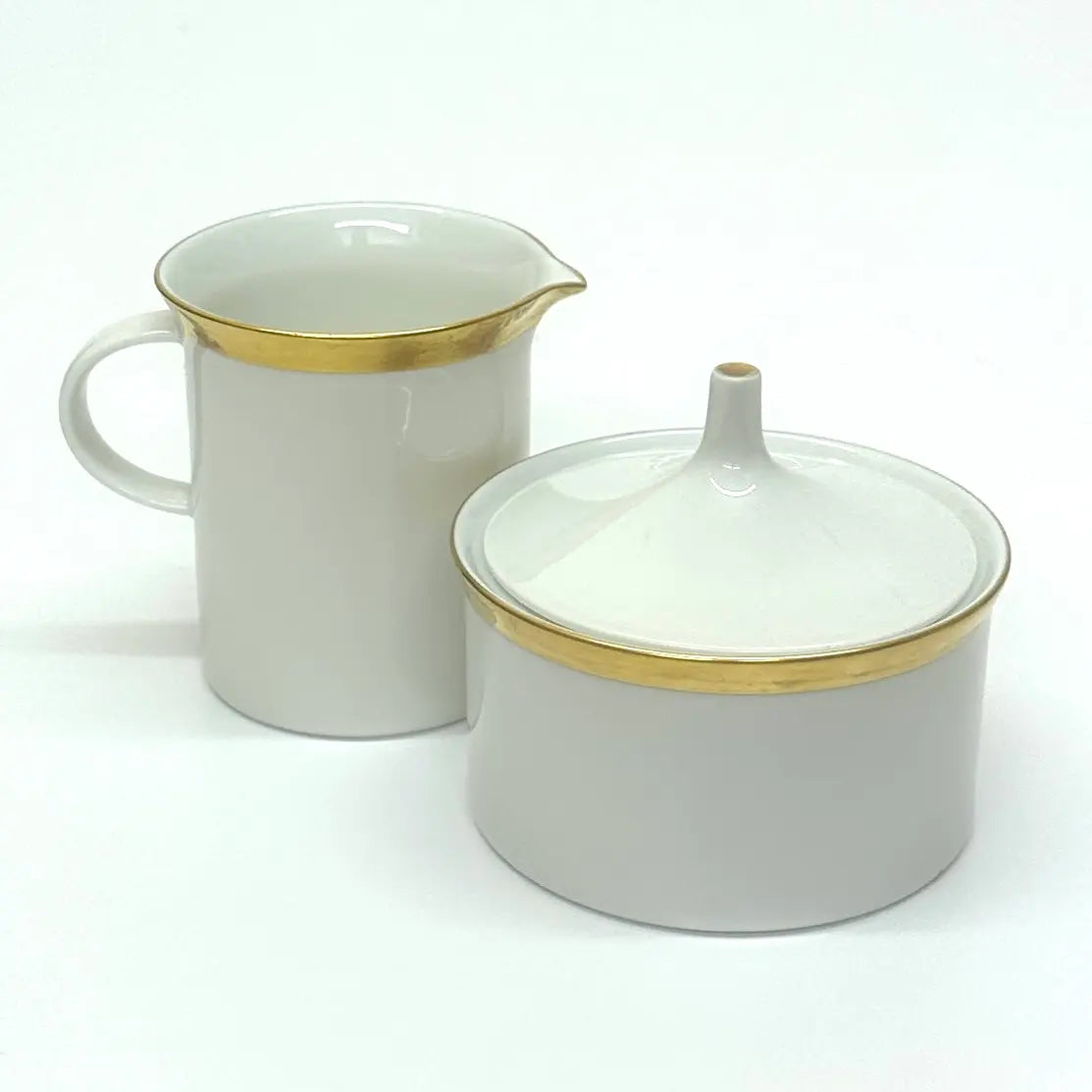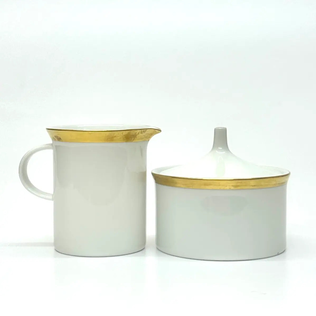 This vintage, delicate porcelain sugar bowl and creamer set, from the Kurfürstendamm design by Rosenthal, features a classic white base accented with elegant gold detailing. In excellent vintage condition, showing only slight patina on the gold trim.