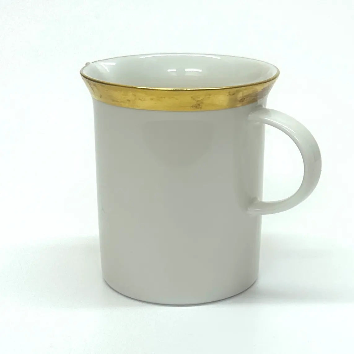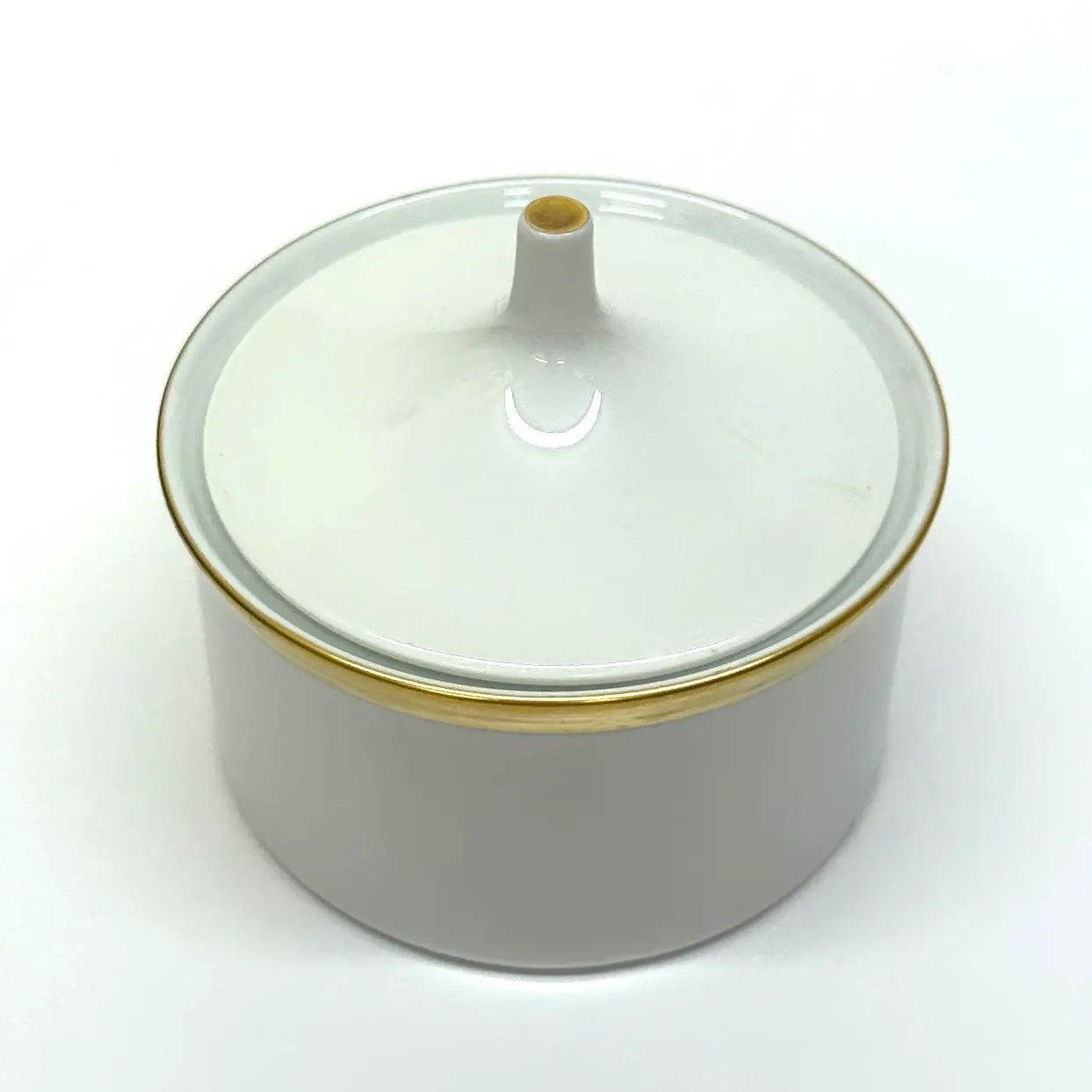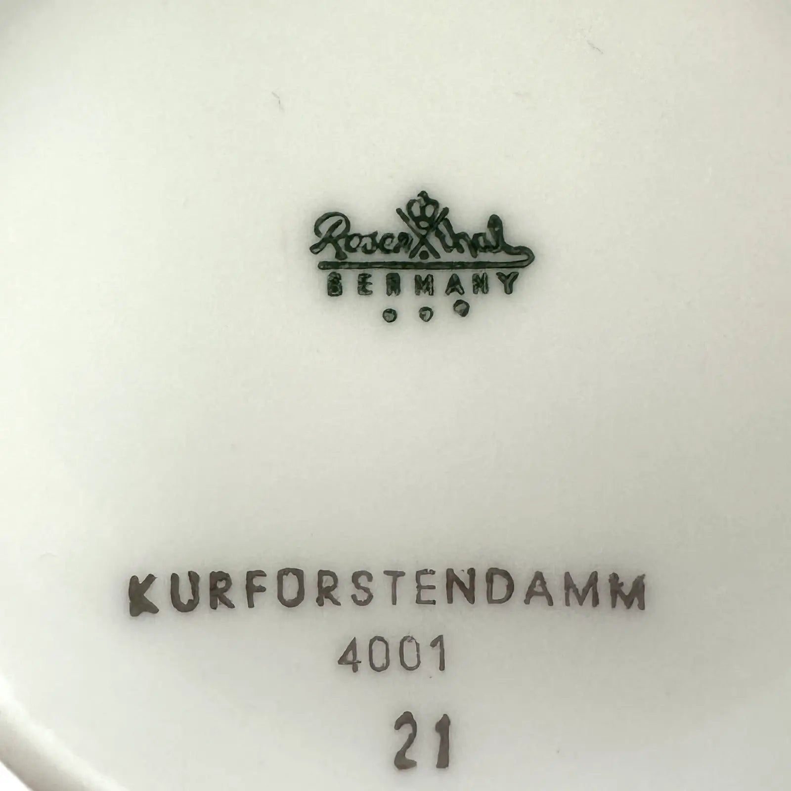 This vintage, delicate porcelain sugar bowl and creamer set, from the Kurfürstendamm design by Rosenthal, features a classic white base accented with elegant gold detailing. In excellent vintage condition, showing only slight patina on the gold trim.